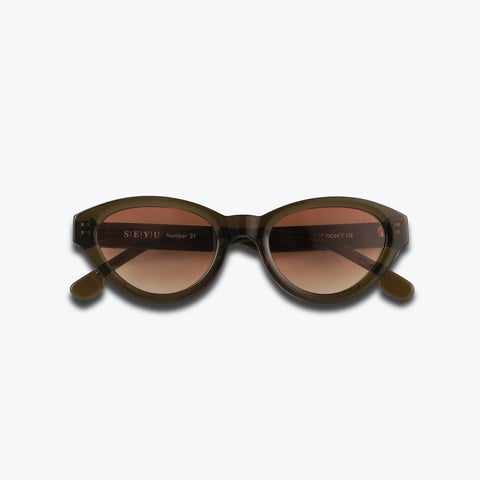 Die SEYU Number 21 Green Brown vereint einen olivgrünen Cateye-Rahmen mit sanft braun getönten Gläsern – ein ausgewogener Look, der sowohl weich als auch ausdrucksstark wirkt. Die Form ist markant, die Ausstrahlung lässig. Eine Sonnenbrille für alle, die subtile Statements setzen möchten.